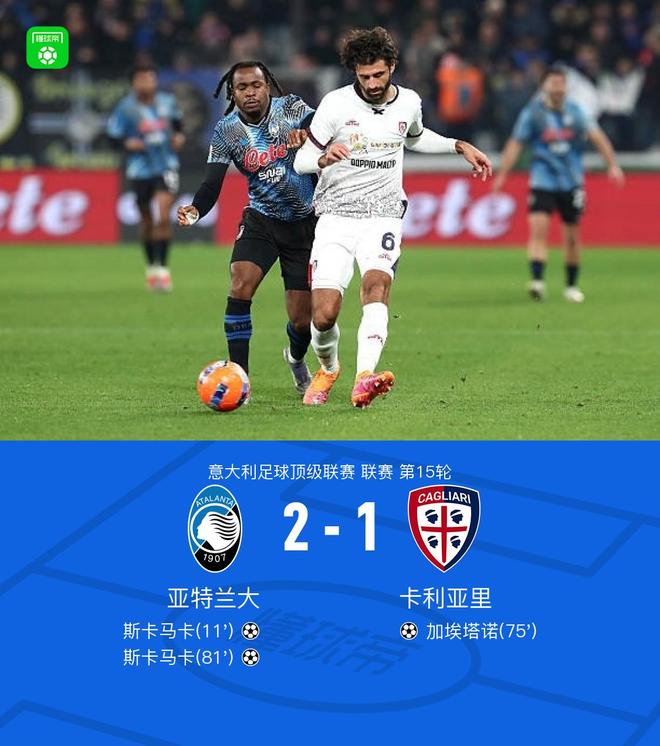 北京时间12月14日,意大利足球顶级联赛第15轮,亚特兰大坐镇主场迎战卡利亚里。比赛中,扎帕科斯塔送出精准助攻,帮助斯卡马卡率先打破僵局。随后,塞巴斯蒂亚诺-埃斯波西托为加埃塔诺创造良机,后者抓住机会扳平比分。比赛后段,斯卡马卡再度建功,完成梅开二度,助球队重获领先。最终全场比分为亚特兰大 2-1 卡利亚里。