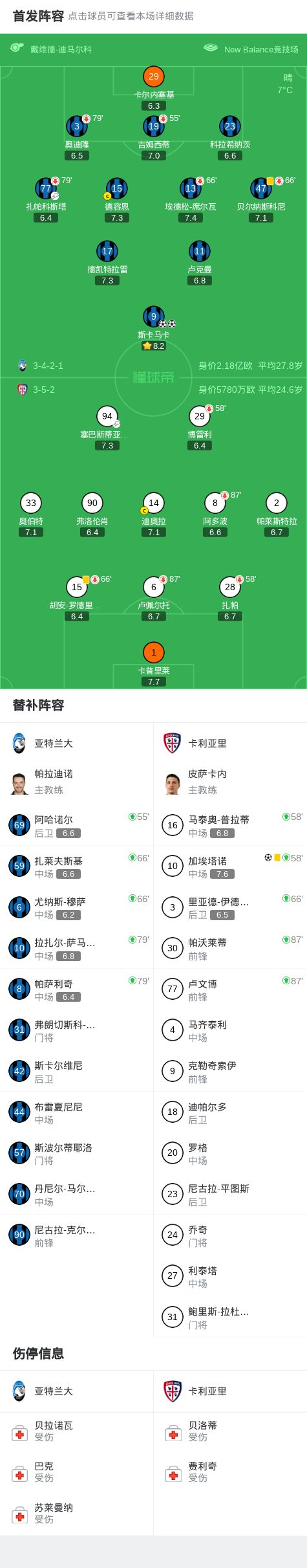 亚特兰大2-1卡利亚里,斯卡马卡双响,加埃塔诺破门